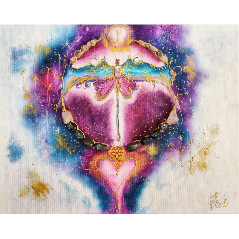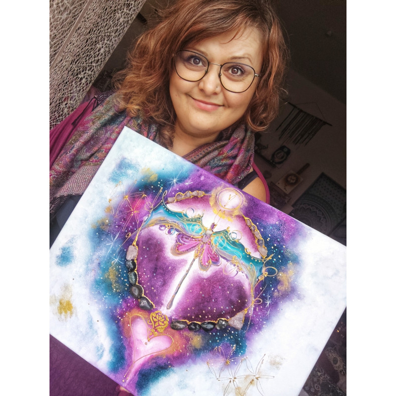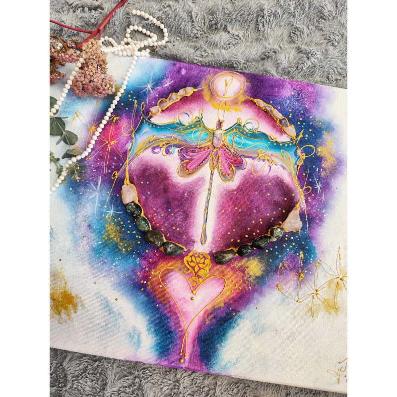 UMÍME být k sobě laskavé? Malba doplněna RŮŽENÍN, KŘIŠŤÁL a MECHOVÝ ACHÁT.