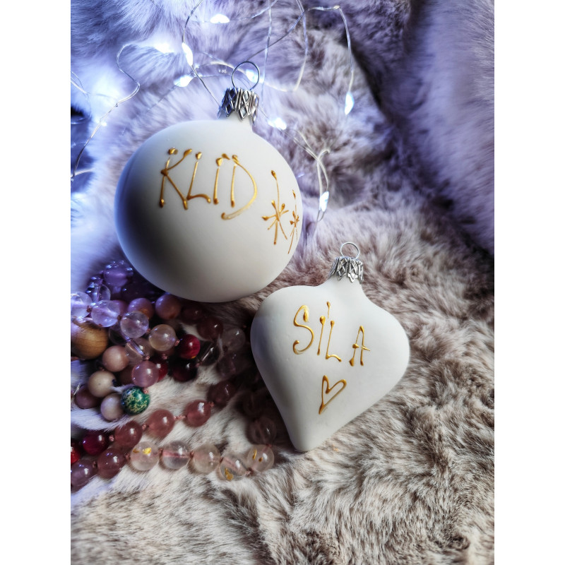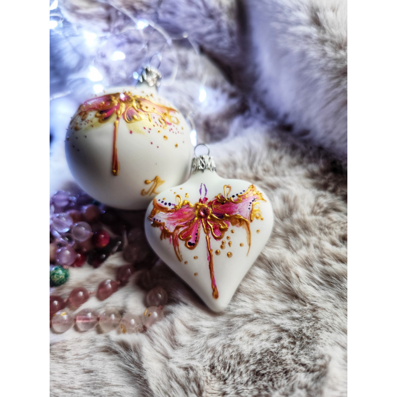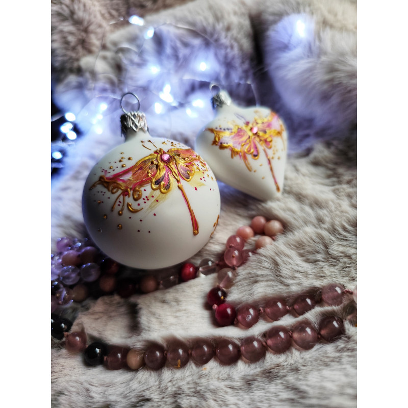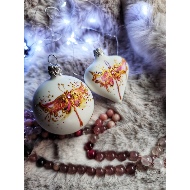 Vánoční skleněné ozdoby o velikosti 6cm, 5cm vyrobeny v české sklárně. Ručně ozdobeny autorským obrazem a kamínky swarovski.