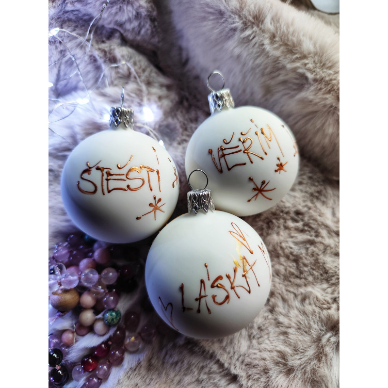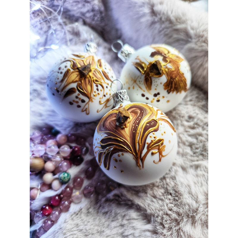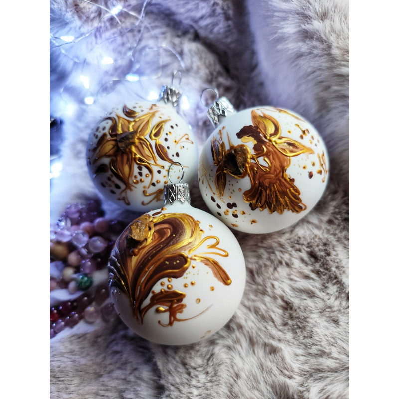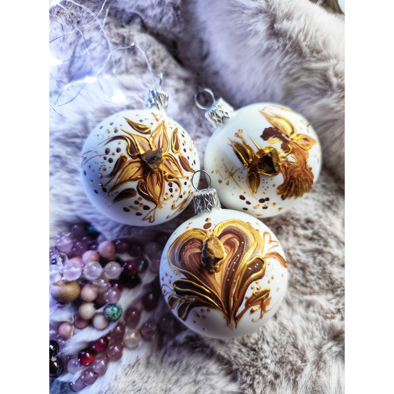 Vánoční skleněné ozdoby o velikosti 6cm, 5cm vyrobeny v české sklárně. Ručně ozdobeny autorským obrazem a tygřím okem.