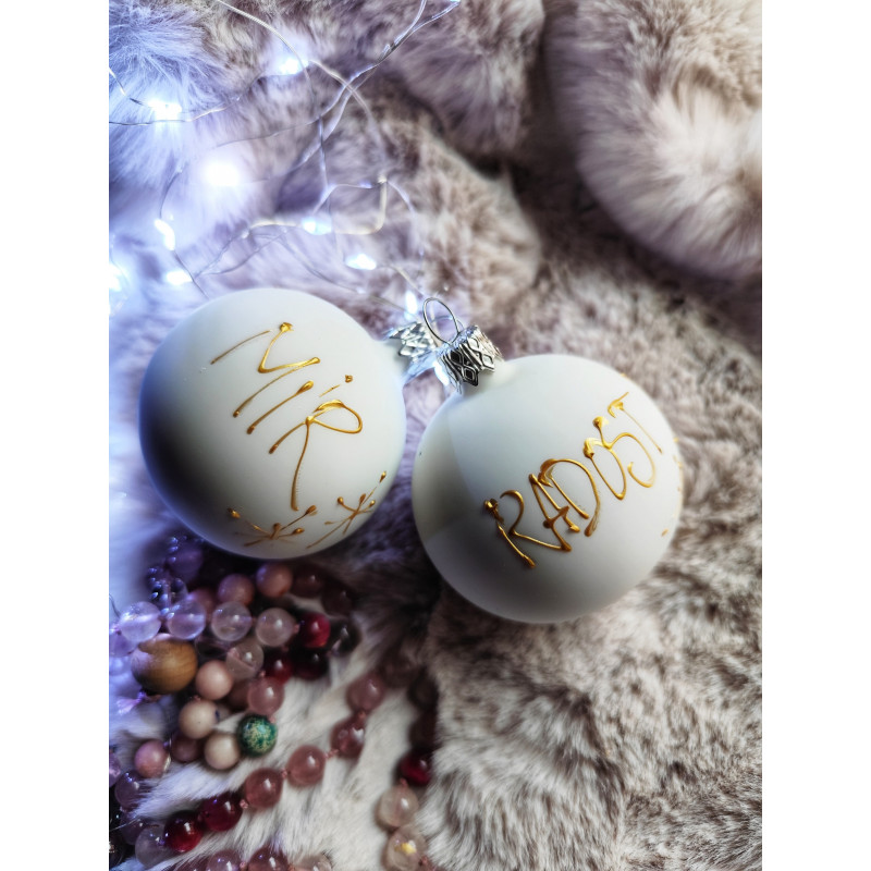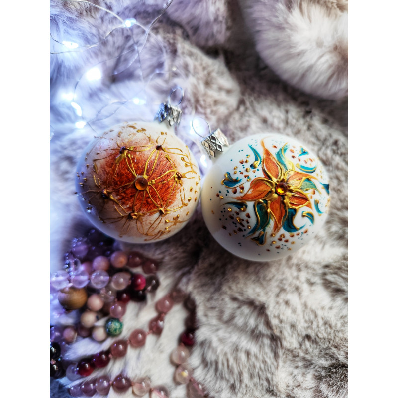 Vánoční skleněné ozdoby o velikosti 6cm vyrobeny v české sklárně. Ručně ozdobeny autorským obrazem a kamínky swarovski.