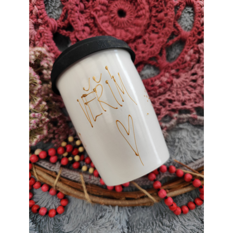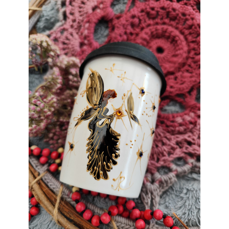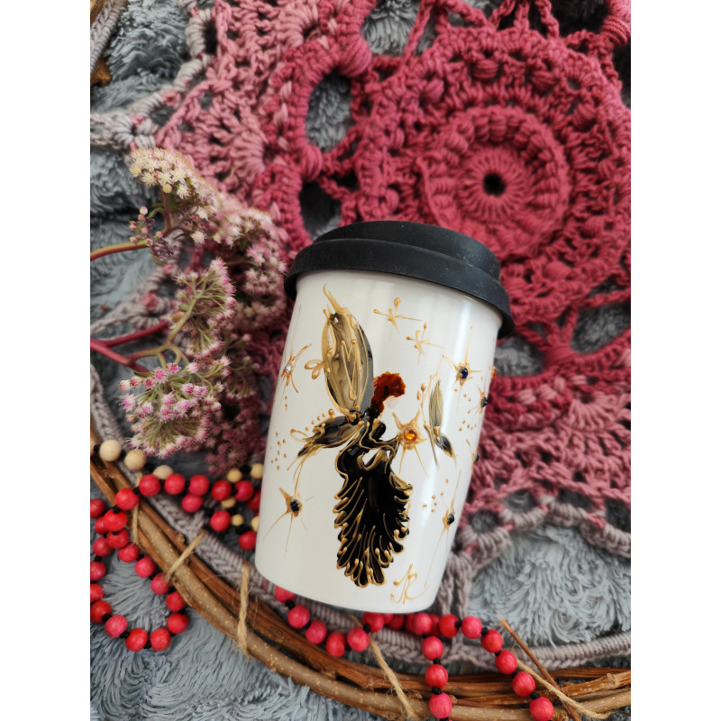 Porcelánový termo hrnek s dvojitou stěnou (TO GO) malovaný barvami na porcelán. Autorská malba je zafixována vysokou teplotou. Doplněna KAMÍNKY SWAROVSKI.