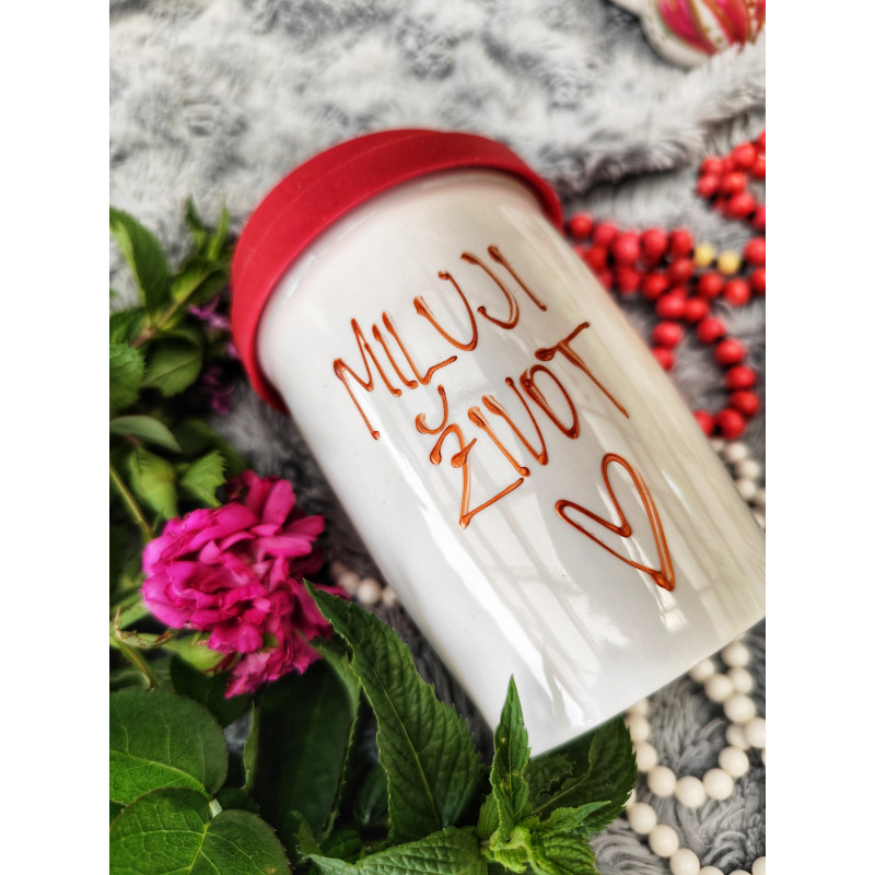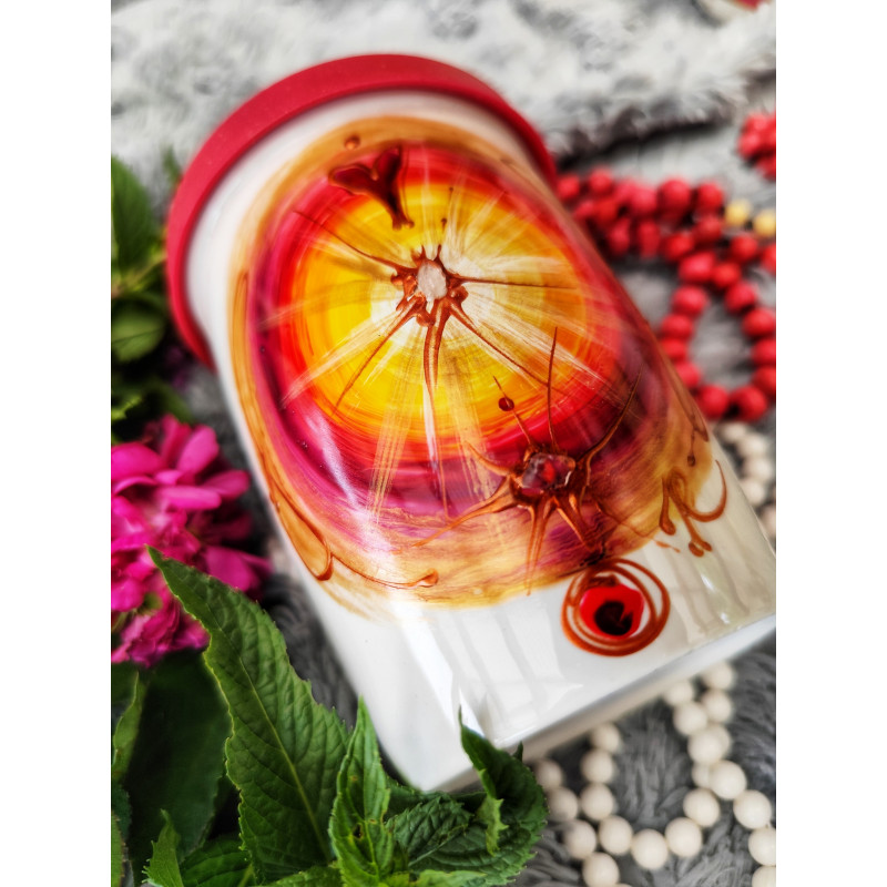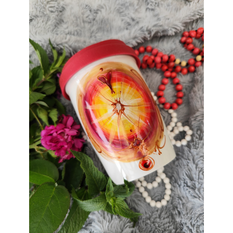 Porcelánový termo hrnek s dvojitou stěnou (TO GO) malovaný barvami na porcelán. Autorská malba je zafixována vysokou teplotou. Doplněna KAMÍNKY SWAROVSKI.