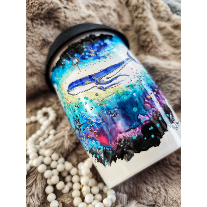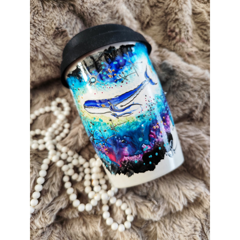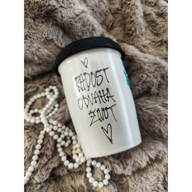 Porcelánový termo hrnek s dvojitou stěnou (TO GO) malovaný barvami na porcelán. Autorská malba je zafixována vysokou teplotou. Doplněna KAMÍNKY SWAROVSKI.